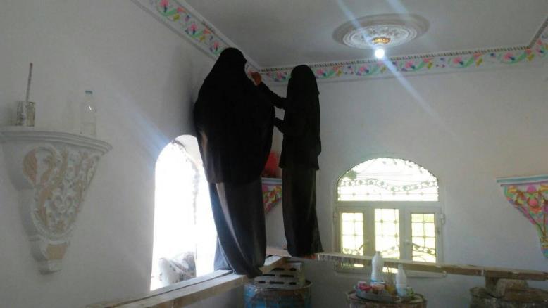 بحماس وشغف كبيرين تعكف الأخوات الثلاث إلى جانب والدهن الخمسيني على إكمال أعمالهن، يصعدن السلالم الخشبية ويقمن بطلاء الجدران ونقش الديكور وكذلك خلط الإسمنت وترميم المنازل في قريتهن القابل في وادي ظهر الواقعة على أطراف العاصمة صنعاء.