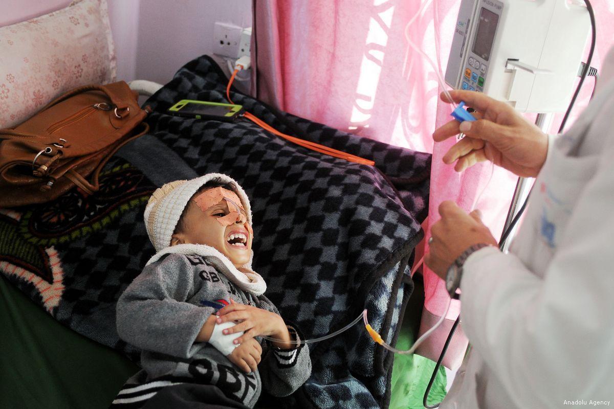 طفل مصاب بسوء التغذية يبكي وهو يتلقى العلاج الطبي في مستشفى السبين للأمومة في صنعاء ، و يعيش ملايين الأطفال حول العالم خارج البلدان التي ولدوا فيها أو داخلياً النازحين في بلدانهم بسبب الحرب والصراعات والجوع، في اليمن ، حيث توجد واحدة من أعظم الأزمات الإنسانية في العالم ، يفقد الطفل كل 10 دقائق حياته في المتوسط كل 10 دقائق.