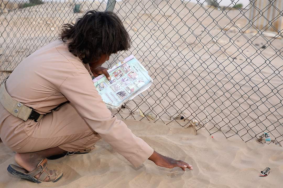 يحمل الطفل اليمني كتابا للغة الإنجليزية، ويعتمد على كتابة دروسه على الرمل للمذاكرة، يذكر أن الحرب اليمنية دمرت آلاف المدارس وبات أكثر من مليون طفل خارج العملية التعليمية بحسب تقارير أممية.