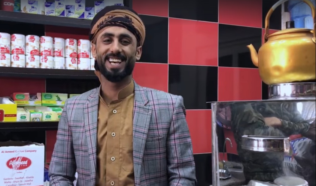 برقصات تقليدية يمنية، يجذب خلدون زبائنه من الخط السريع، وينجح في لفت انتباههم ليتوقفوا ويشاركوه الابتسامة قبل أن يذهبوا معه إلى المحل الذي يبيع فيه القهوة.